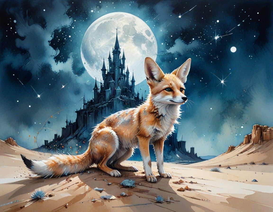 This image shows a desert caravanserai at night under bright stars, with a small fox walking on the sand. The image blends expressive watercolour techniques with ethereal stylization.
