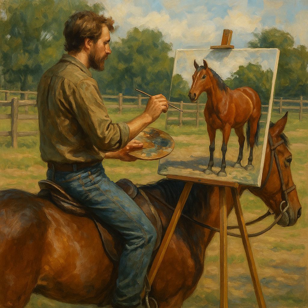 This image depicts an artist on horseback, creating a painting of another horse on a farm. The artwork captures the rural setting and equestrian subject matter.