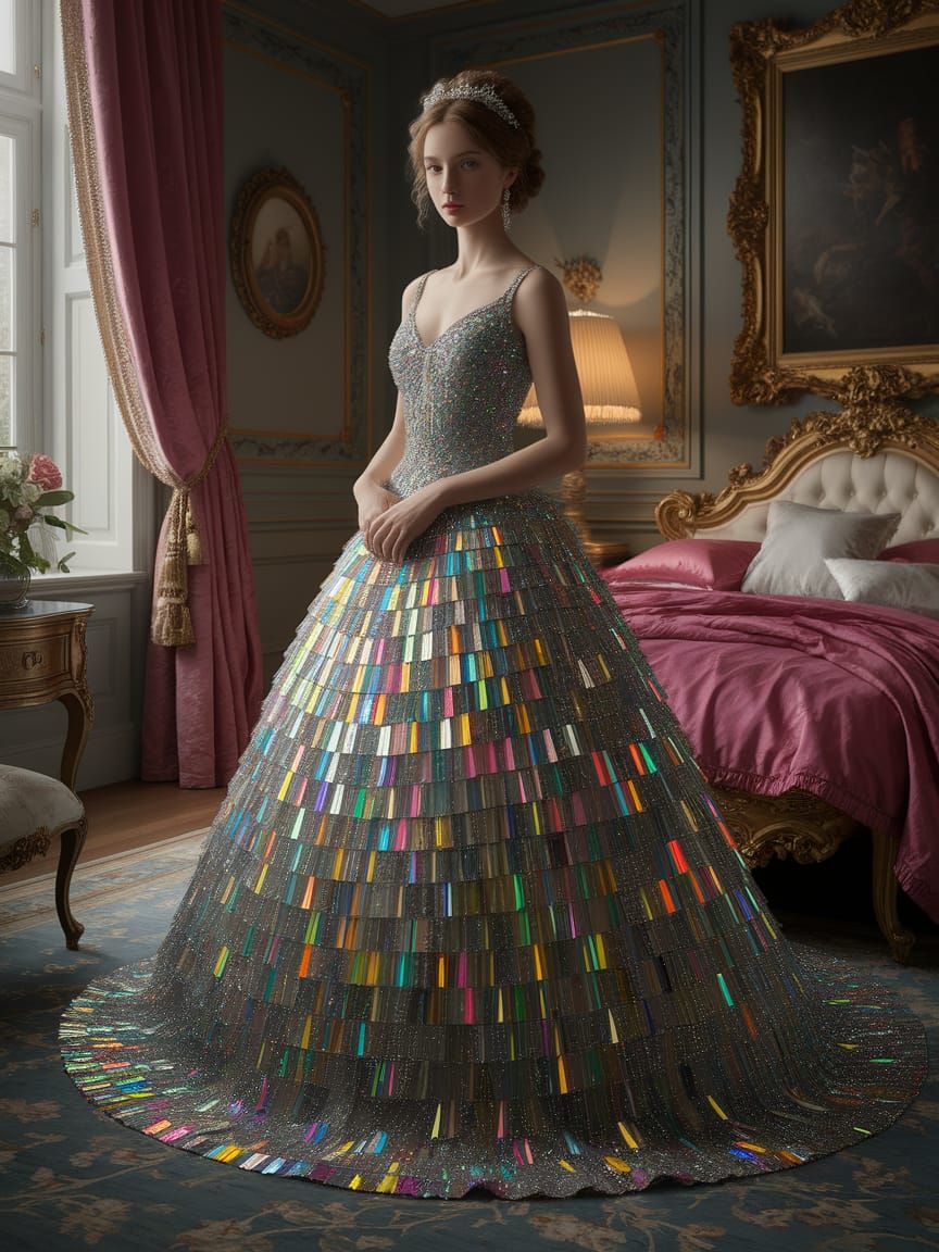 This image shows a stunning full-length portrait of a woman in an exquisite gown crafted from sparkling glass prisms, set in a richly detailed, softly lit bedroom. Presented as an impressionist oil painting with mixed textures and prismatic effects.