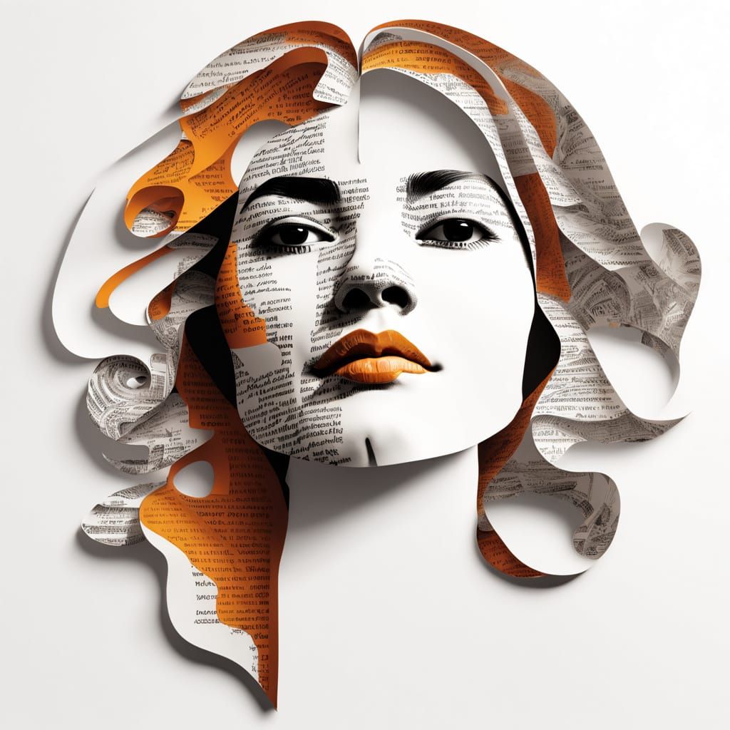 This image shows a woman escaping from a world of newspapers. Text merges with her form in a surreal manner, rendered with softened features and a body-painted effect. The style evokes a subverted narrative, reminiscent of textured and layered painting.