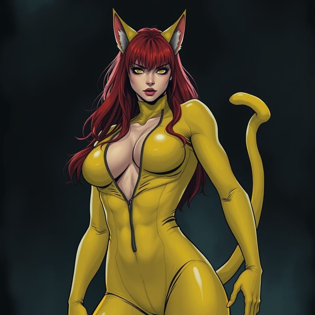 A mysterious, full-body portrait of a redhead woman with cat ears and tail, wearing a bold yellow catsuit, in a dark, ominous atmosphere, with a hypnotized expression, and bold lines, in a muted color palette.