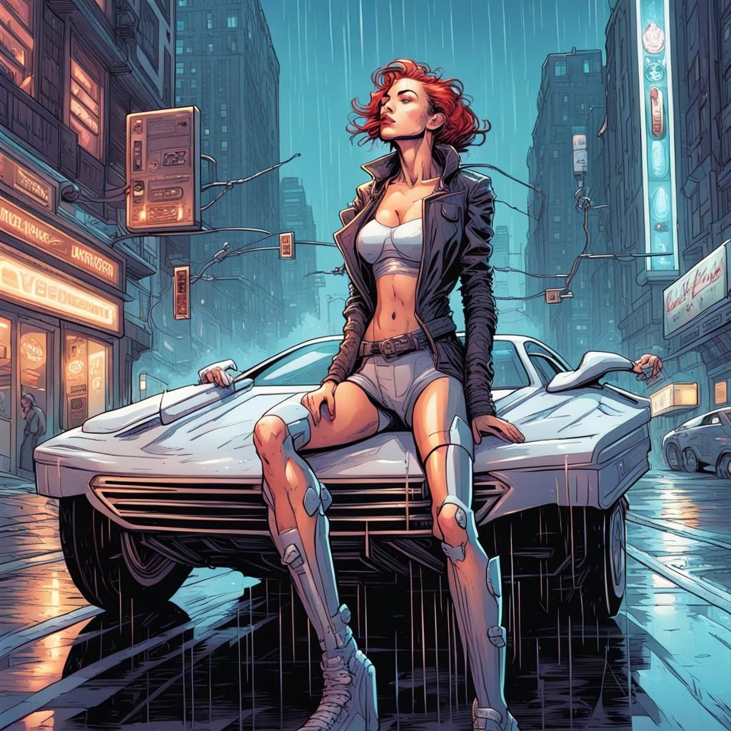 This image shows a cyborg woman with a cybernetic face enjoying ice cream. She is leaning against a futuristic car in a rain-slicked city, rendered as comic book art.