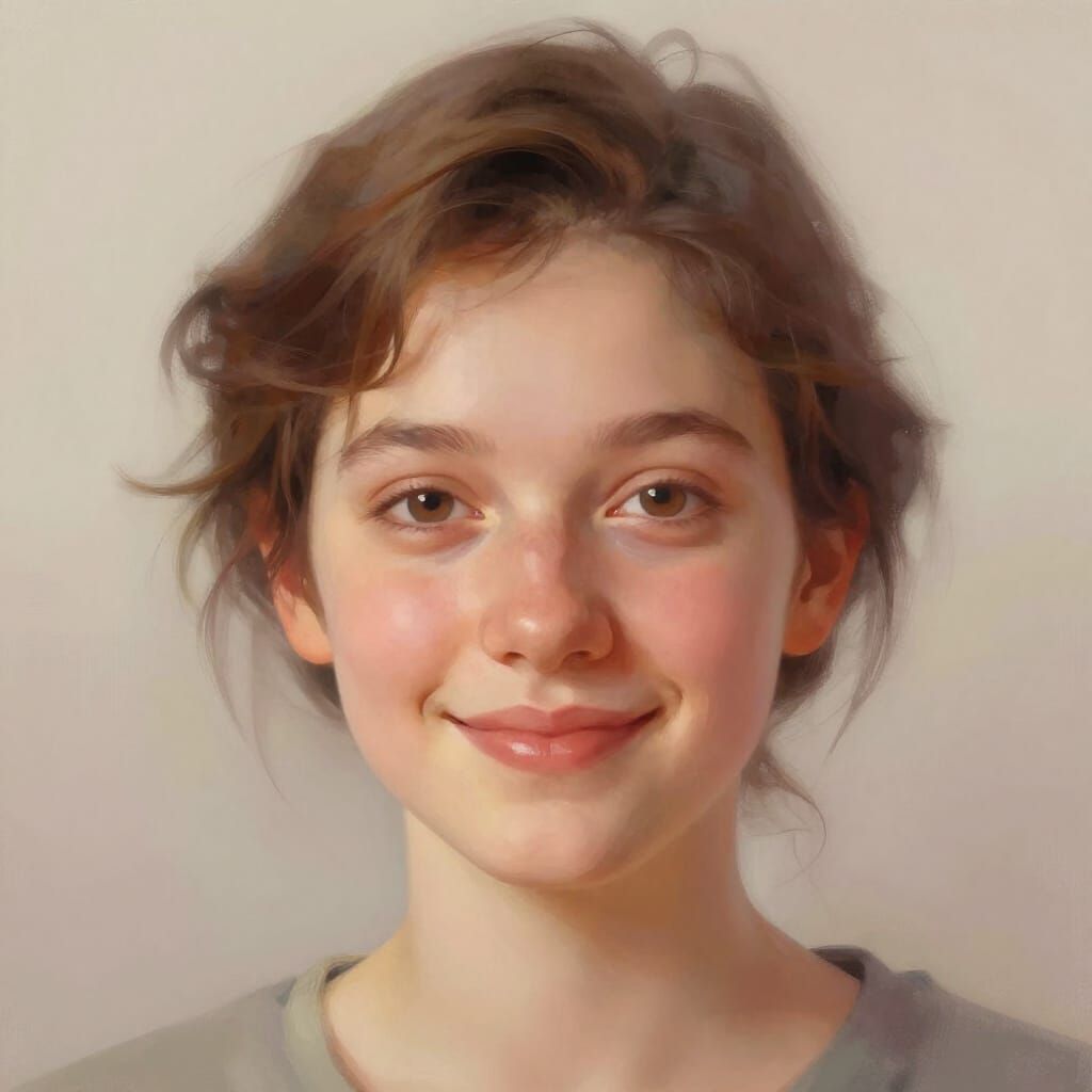 This image shows a person with a warm, approachable demeanor. Soft lighting and pastel colors enhance the serene, empathetic mood. Rendered in a painterly digital art style, evoking smooth gradients and subtle textures.