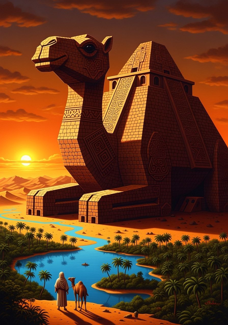 A man and camel observe a colossal, blocky pyramid resembling a camel at dusk. This oil painting features a desert oasis scene with dramatic lighting and a cinematic quality.