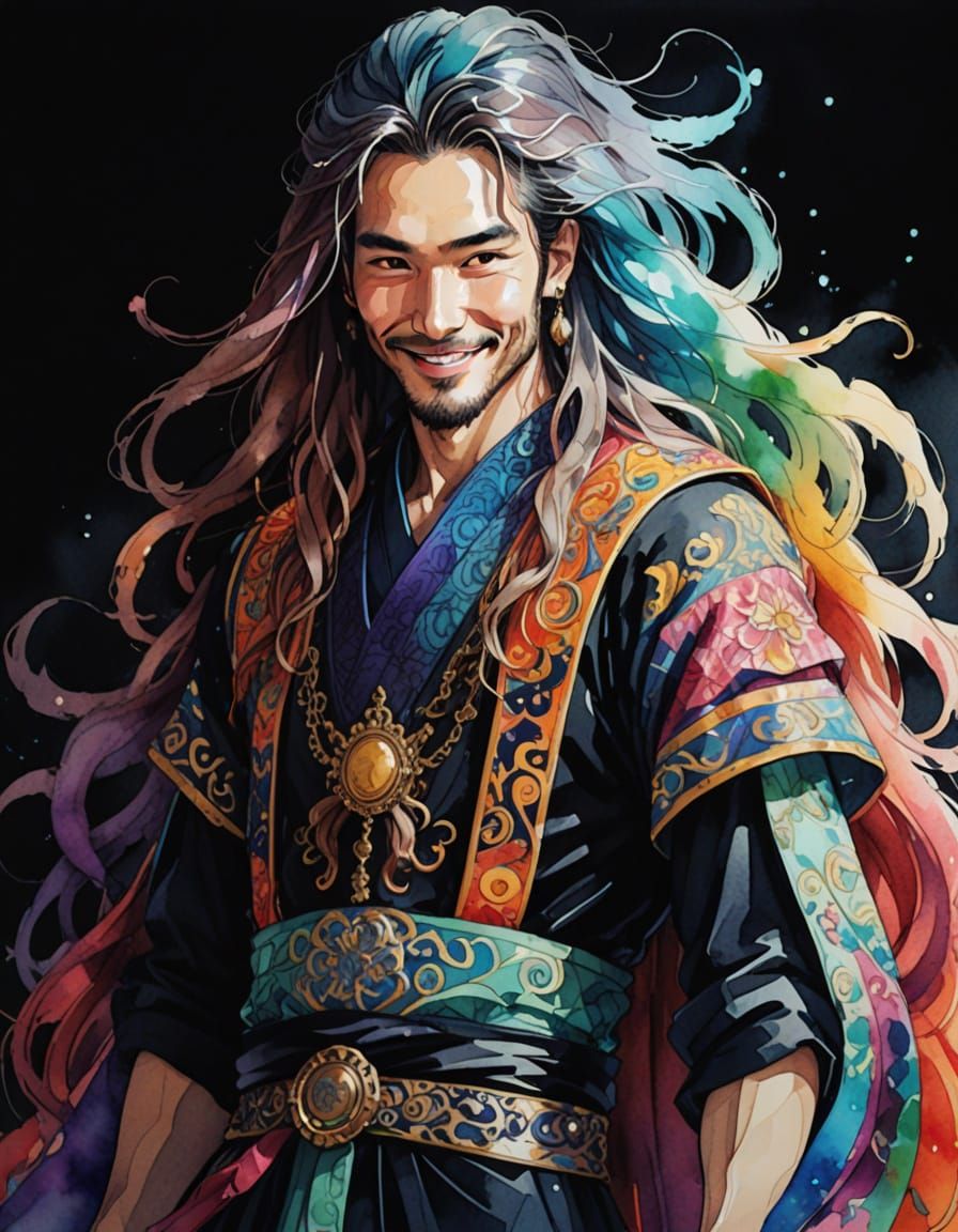 This watercolor and ink painting features a happy, fashion-conscious man with long hair, smiling with a rebellious expression. The art style blends Japonism and expressionism with vivid colors and bold lines.