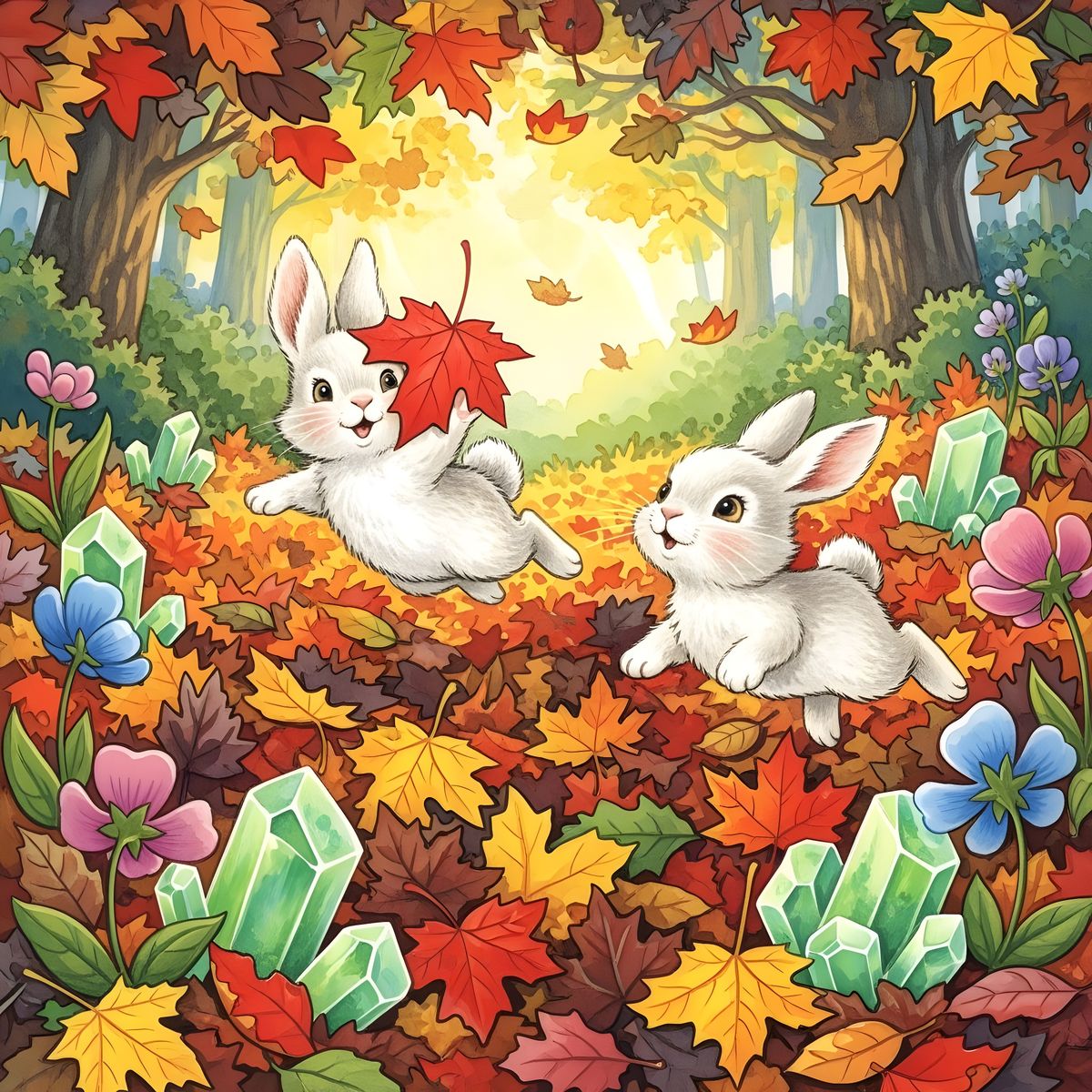 This image showcases two adorable white rabbits frolicking joyfully amidst a vibrant carpet of colorful autumn leaves near a forest, illuminated by emerald crystals and sunlight.