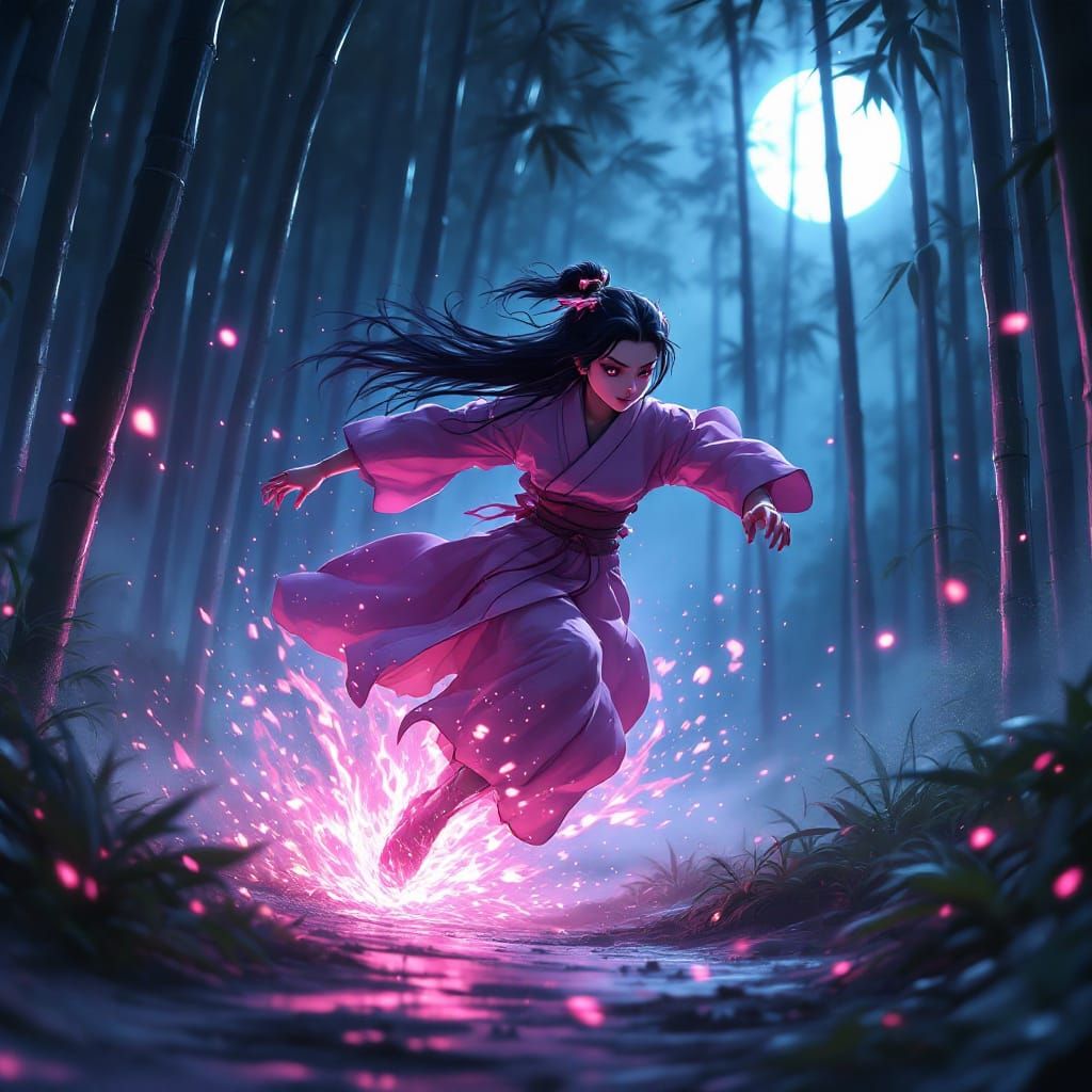 This cinematic anime image shows a demon girl in a pink kimono sprinting through a dark bamboo forest at night, illuminated by moonlight and her own fiery pink magic. Features realistic cell-shading and high-contrast lighting.