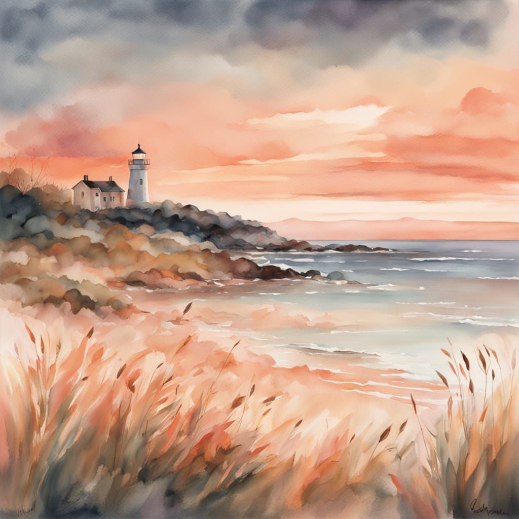This image depicts a serene coastal landscape at sunset, featuring a lighthouse on a bluff. It uses painterly soft brushwork with gentle peach and rose hues on textured clouds, creating a dreamy, tranquil atmosphere.