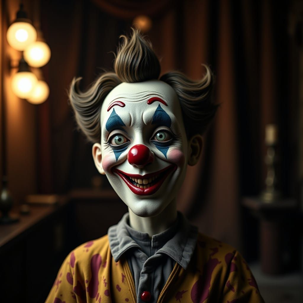 <lora:DARK CLAYMATION:1.0> A portrait of a renowned clown, his painted smile wide but his eyes conveying a profound, quiet joy and contentment after a successful performance. He is backstage, with soft, warm stage lights illuminating his face and a hint of makeup smudges. The style is inspired by classical ...