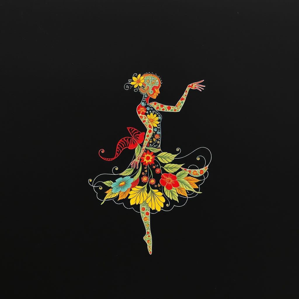 This image shows a complex fractal design with floral elements silhouetted against a dark background. The artwork features a vibrant color palette and alcohol-ink style effects.
