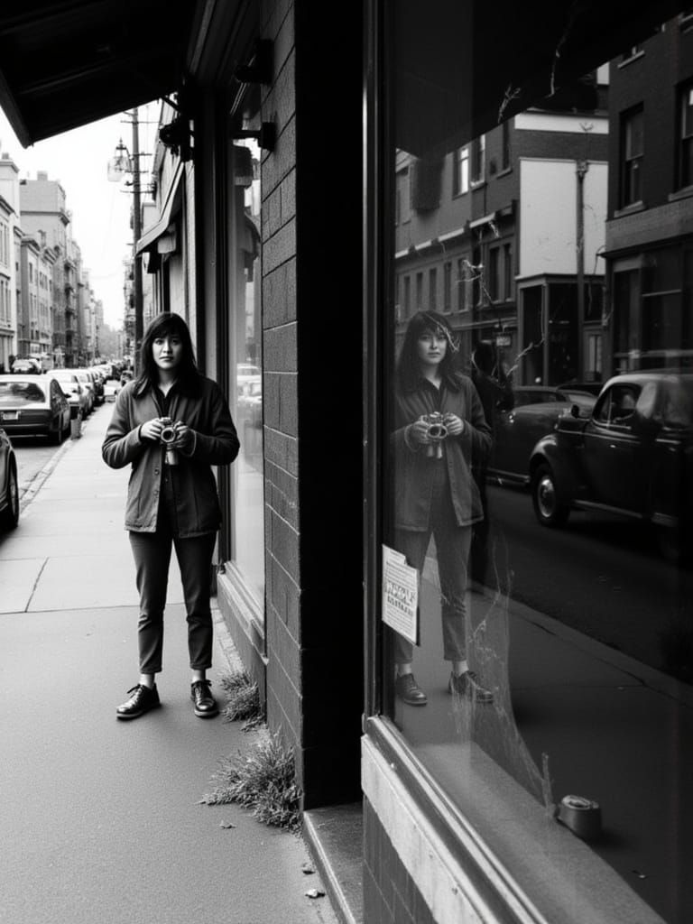 A captivating monochrome portrait capturing a person with a vintage camera, their reflection fragmented in a cracked storefront window, creating a surreal urban scene with soft light and muted details reminiscent of classic photography.