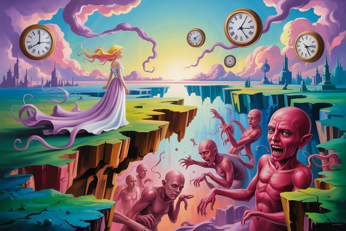 This digital painting shows an ethereal maiden above a chaotic world of demons and floating architecture. Pastel skies contrast with sharp terrain in this 8k surrealist masterpiece.