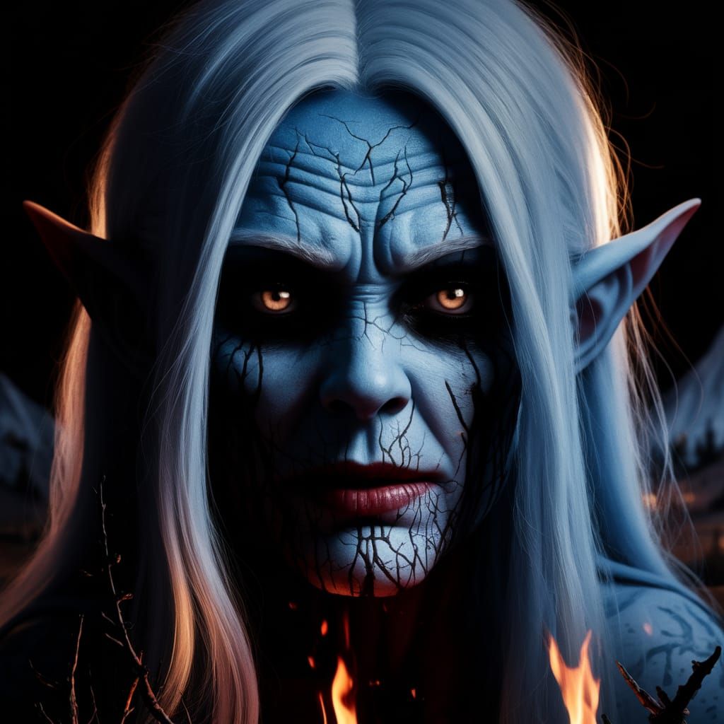 This image depicts a hauntingly beautiful scene of a blue-skinned demoness, Towa, sitting by a campfire under a moonlit sky, her face etched with deep emotional pain. As the scene unfolds, her form transforms into a dark silhouette radiating rage and malice, set against a backdrop of warm, flickering lig...