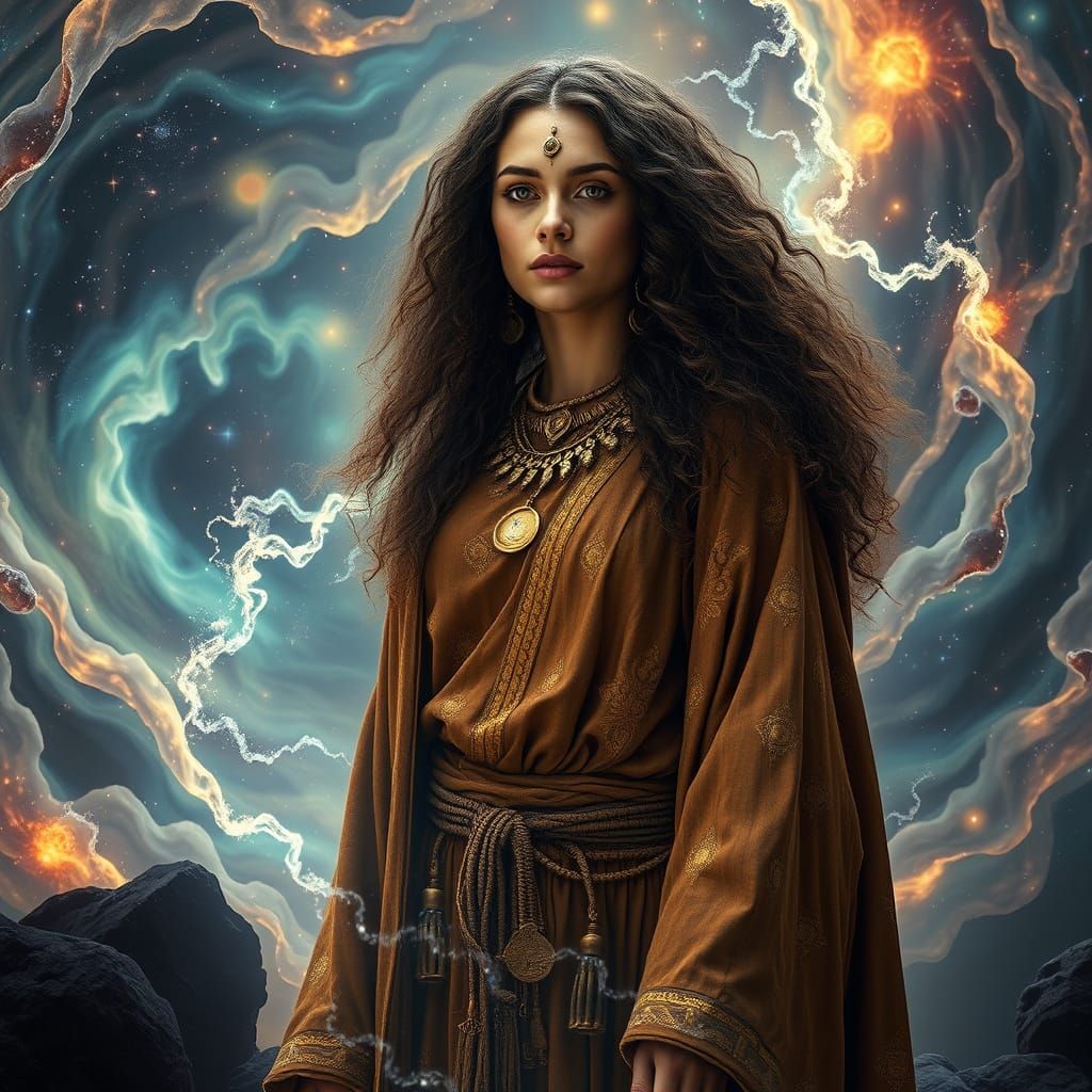 A mystical high priestess stands amidst a swirling vortex of iridescent lights, channeling the divine cosmos. Her long, curly hair flows like the aurora borealis, and her eyes shine like stars, surrounded by shimmering crystalline structures and glowing nebular clouds.