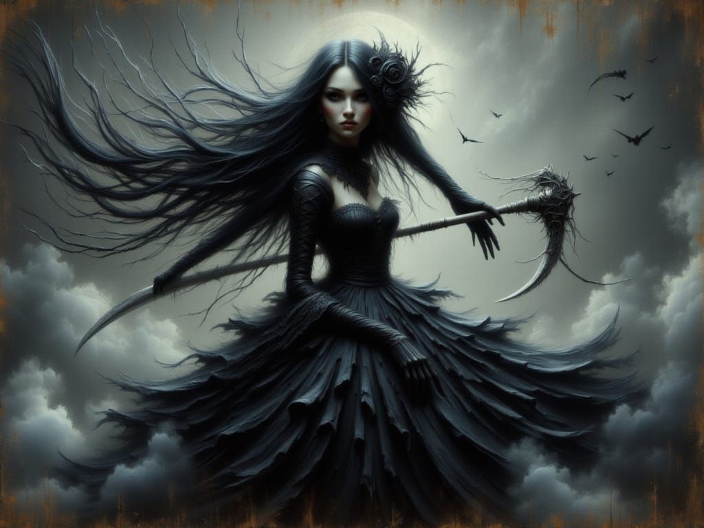 A portrait of Wednesday Addams in a black dress, holding a scythe. The image is highly detailed with textured skin and dramatic cinematic lighting. It is rendered with impasto techniques.
