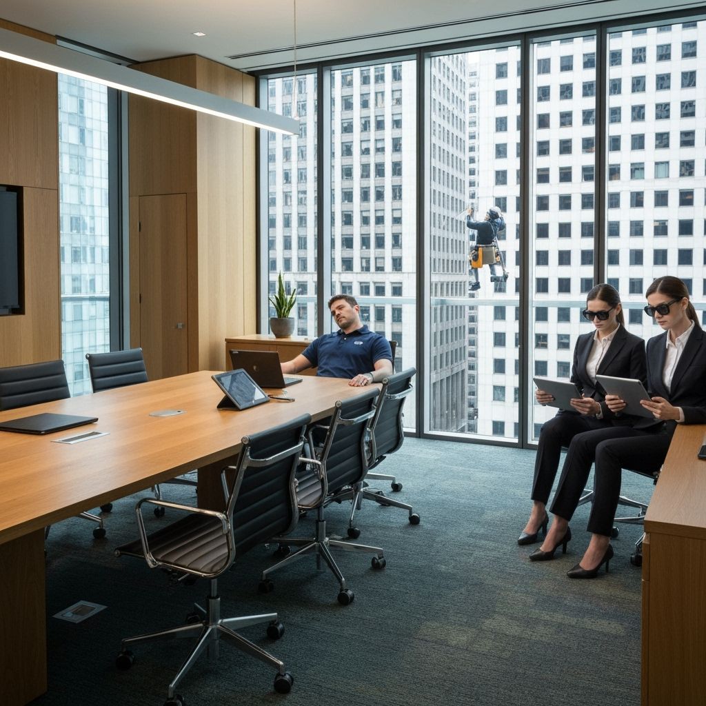 This image shows the interior of a high-end law firm, where a man naps at a conference table as two women work. A window cleaner works outside. The scene is photorealistic.