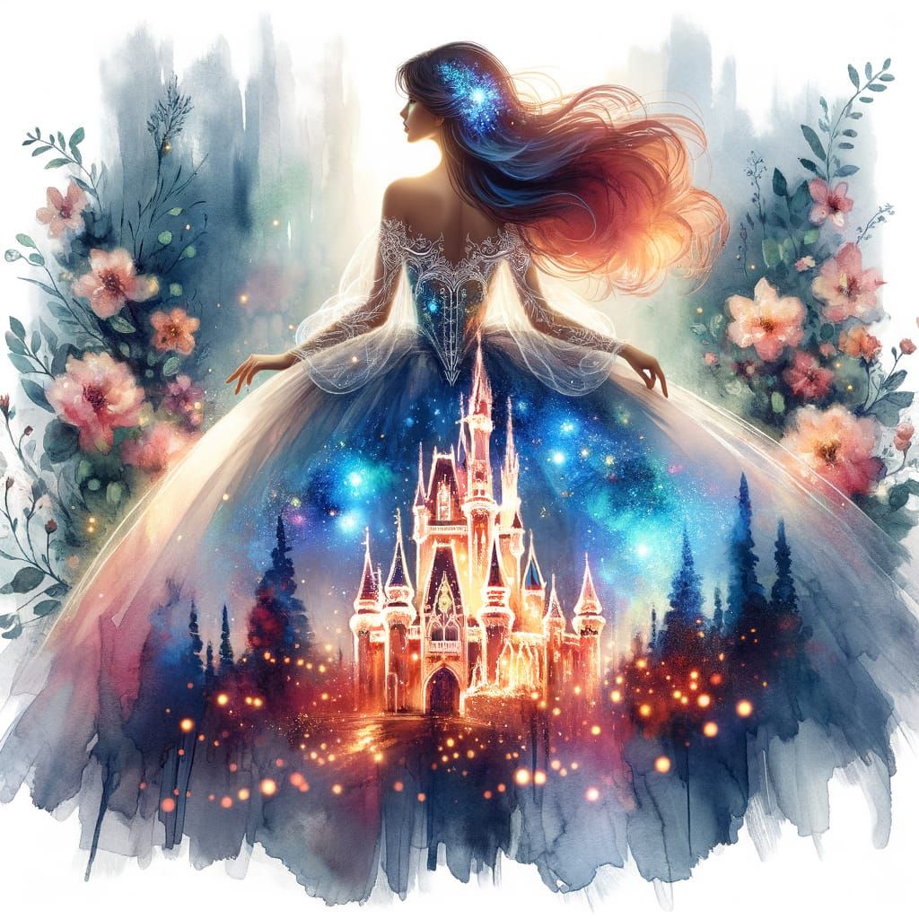 Create a double exposure image in the style of an airbrushed watercolor. On one layer, depict a woman with flowing hair, wearing an elegant ball gown. On the back of her ball gown, superimpose a glowing castle encased in magical twilight energy. The entire scene should blend elegance and wonder, illuminated ...