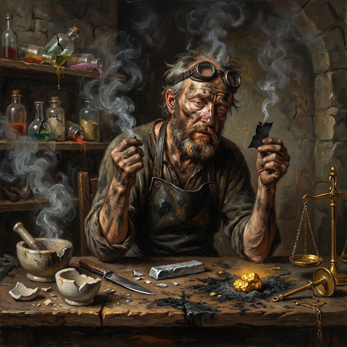 This image shows a dejected medieval alchemist amidst a ruined laboratory after an explosion. The artwork features thick impasto oil painting with dramatic lighting, highlighting soot and a gleam of gold.