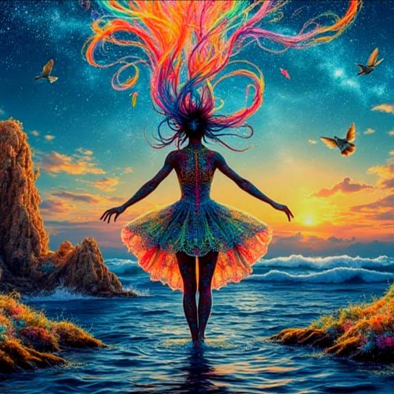 This image shows a woman dancing, depicted with double exposure and colorful ink flow effects. Her hair transforms into vibrant braids against swirling, abstract patterns in a psychedelic style. A cosmic ballet unfolds.