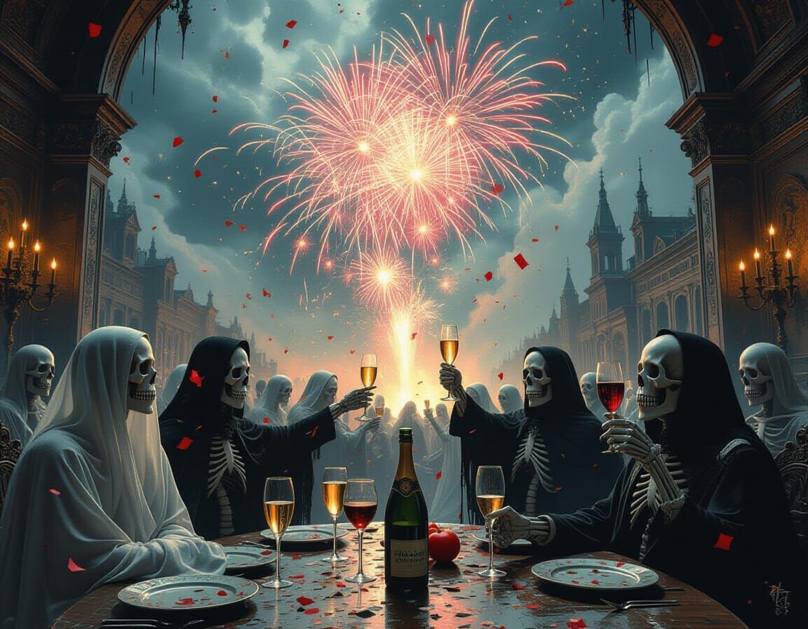 This image depicts a grim, gothic New Year's Eve celebration in a decaying ballroom, featuring ghosts and skeletons. The scene includes fireworks and is rendered in a dark, atmospheric horror art style with dramatic lighting.