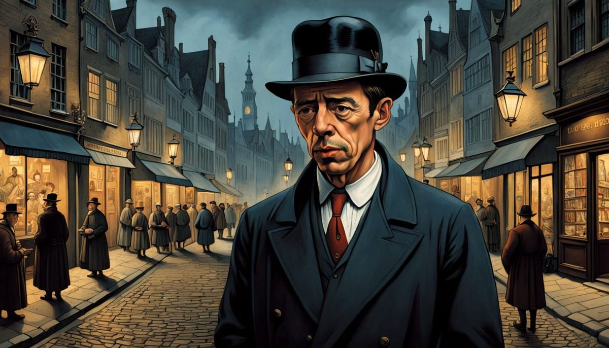 This image shows a detailed ligne claire portrait of Jacques Brel in a Belgian street scene. The art style features intricate line work, hatching, and moody lighting, evoking a sense of melancholy.