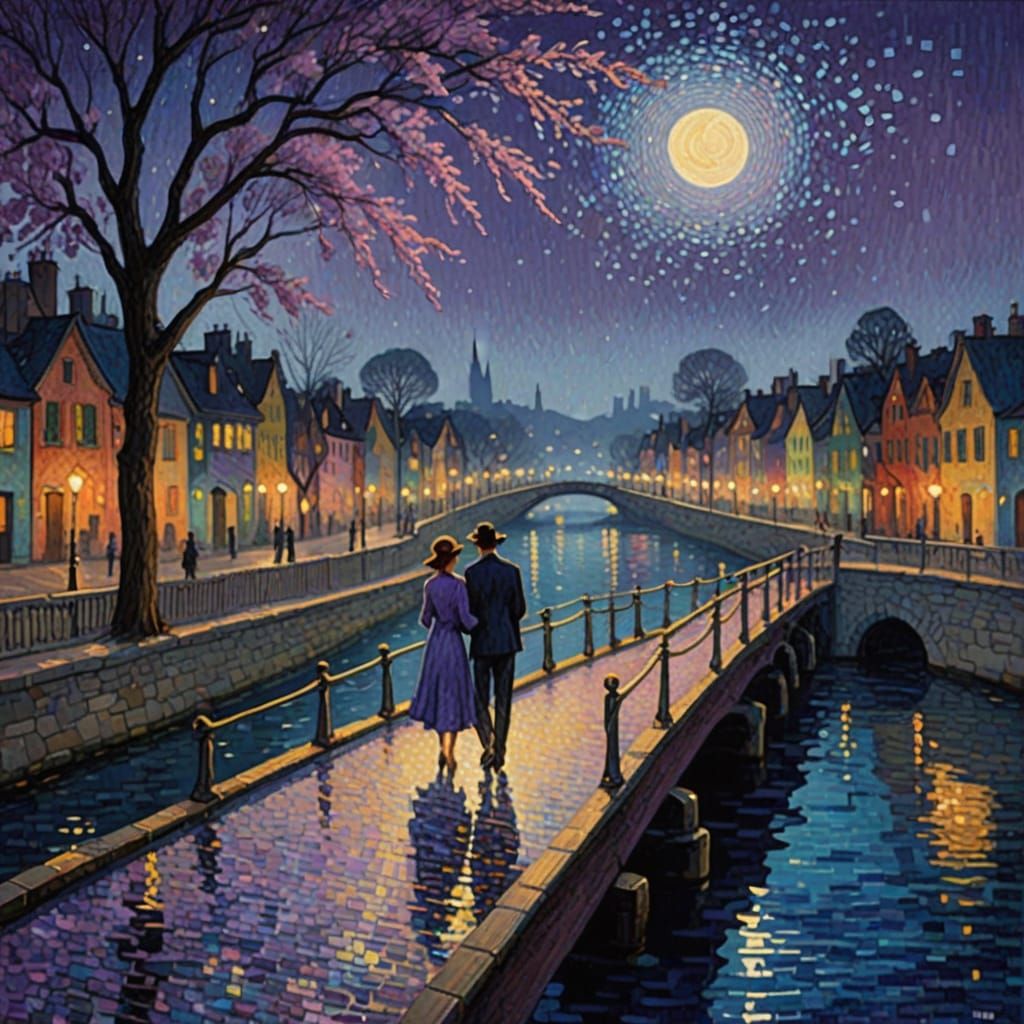 This enchanting image depicts a romantic couple on a footbridge at night, bathed in the soft, shimmering light of a crescent moon. Inspired by the masters of Pointillism, this dreamy scene features warm, golden tones and vibrant, expressive brushstrokes.
