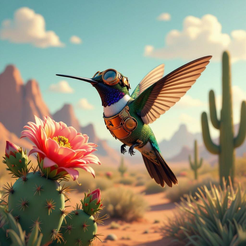 This image shows a steampunk hummingbird with copper details flitting among colorful desert flowers. The scene is rendered as 3D digital art, featuring bold lines and dramatic lighting.