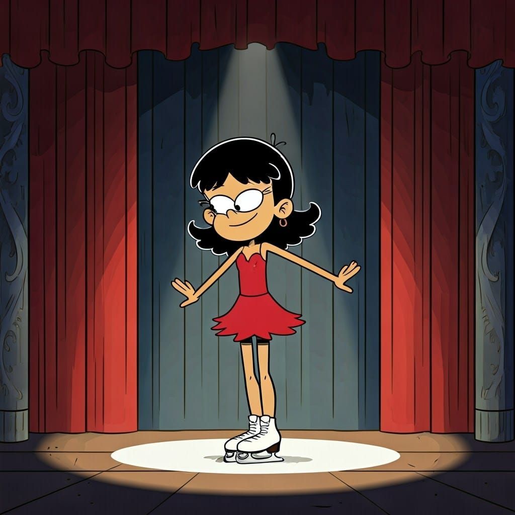 Stella Zhau is figure skating on a stage. She is wearing a red figure skating formal dress. The stage is rendered in The Loud House cartoon style, with bright, bold colors and exaggerated expressions. The lighting is dramatic, casting long shadows across the stage, reminiscent of a theatrical production. ...