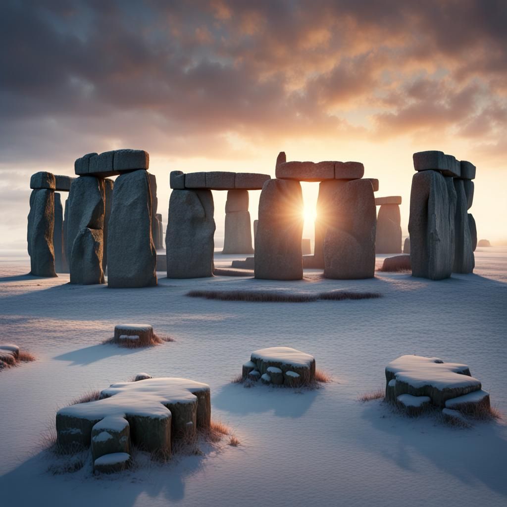 A striking picture of Stonehenge at sunrise during the winter solstice. The scene is presented as a dramatic digital matte painting, rich with intricate details and atmospheric perspective.