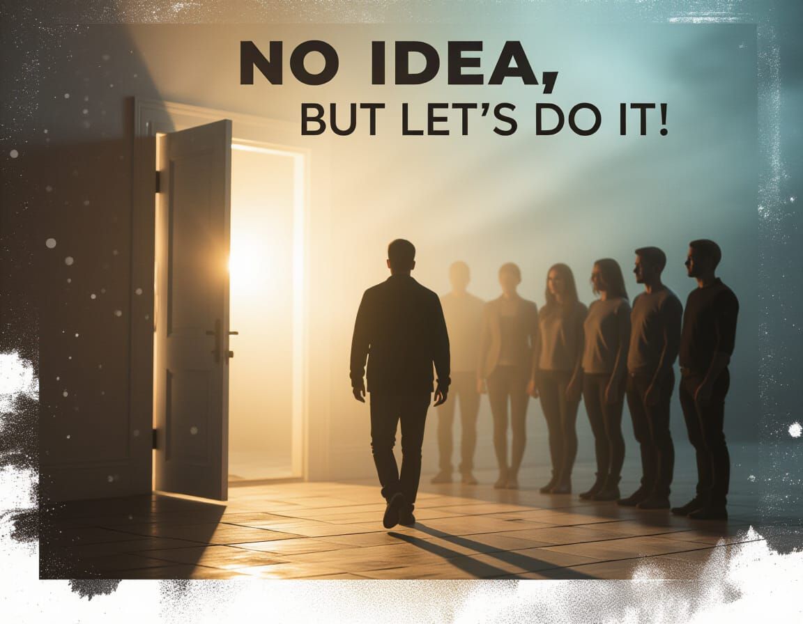 A photorealistic banner shows a lone figure entering an illuminated space. Cinematic lighting highlights dust motes, with a supportive circle in silhouette. Hopeful and grounded mood.