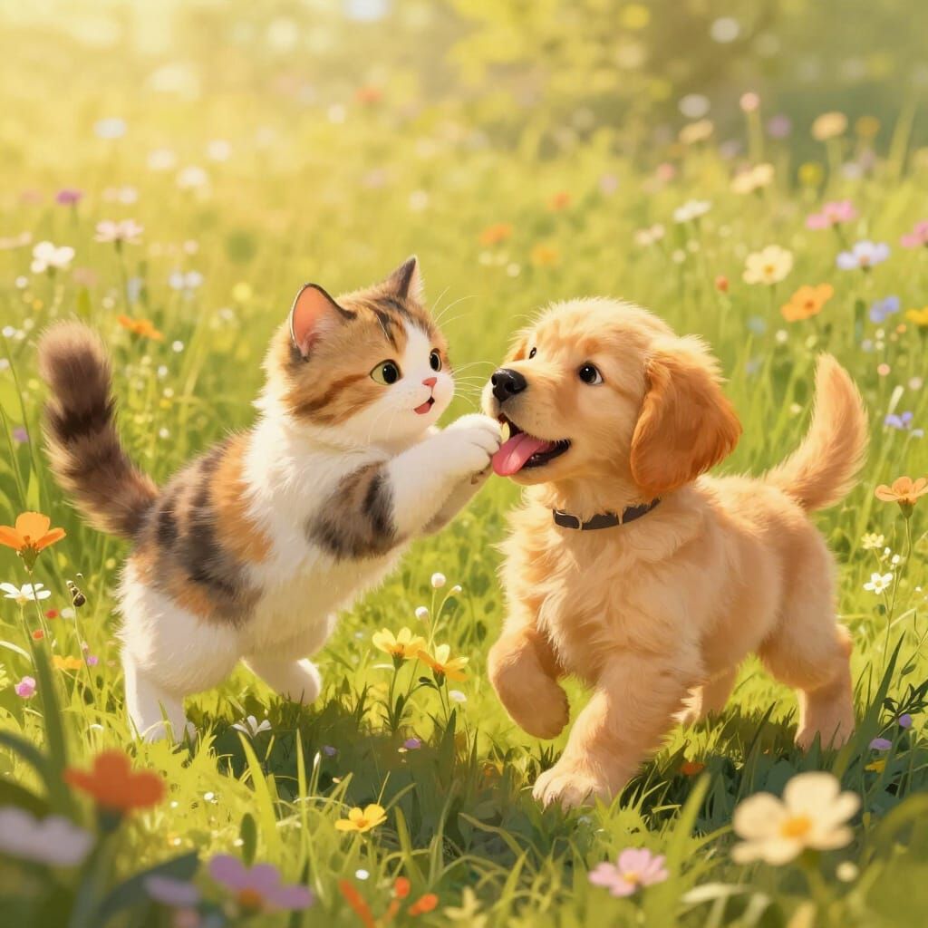 This image shows a fluffy calico cat and golden retriever puppy playing in a sunlit field of wildflowers, rendered in a whimsical, painterly style with vibrant colors.