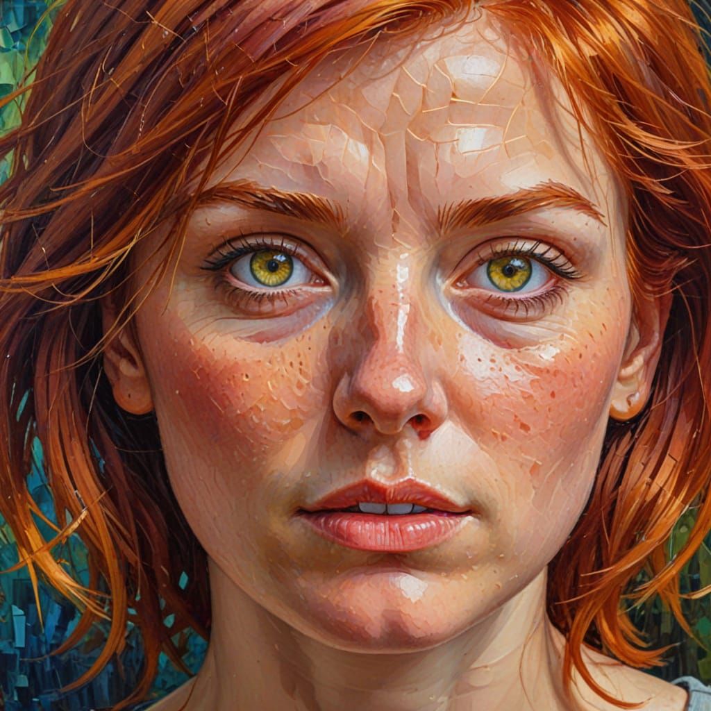 A striking portrait of a red-haired woman with fiery eyes. This neo-impressionistic painting uses vivid brushstrokes and impasto techniques with warm golden lighting to convey energy.