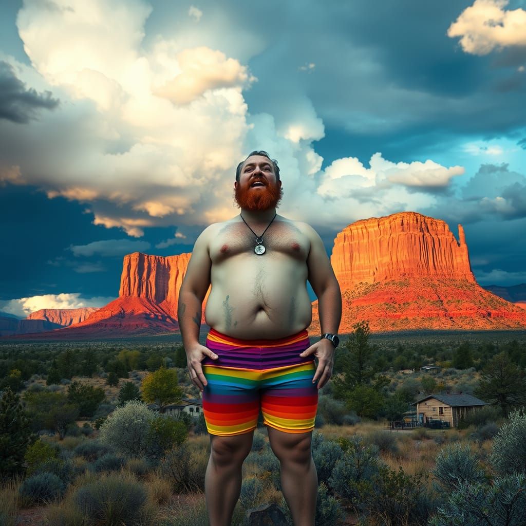 A hyper-realistic image of a burly, bearded man in rainbow shorts at the Colorado National Monument. Psychedelic storm clouds gather in the background with vibrant, electric colors.