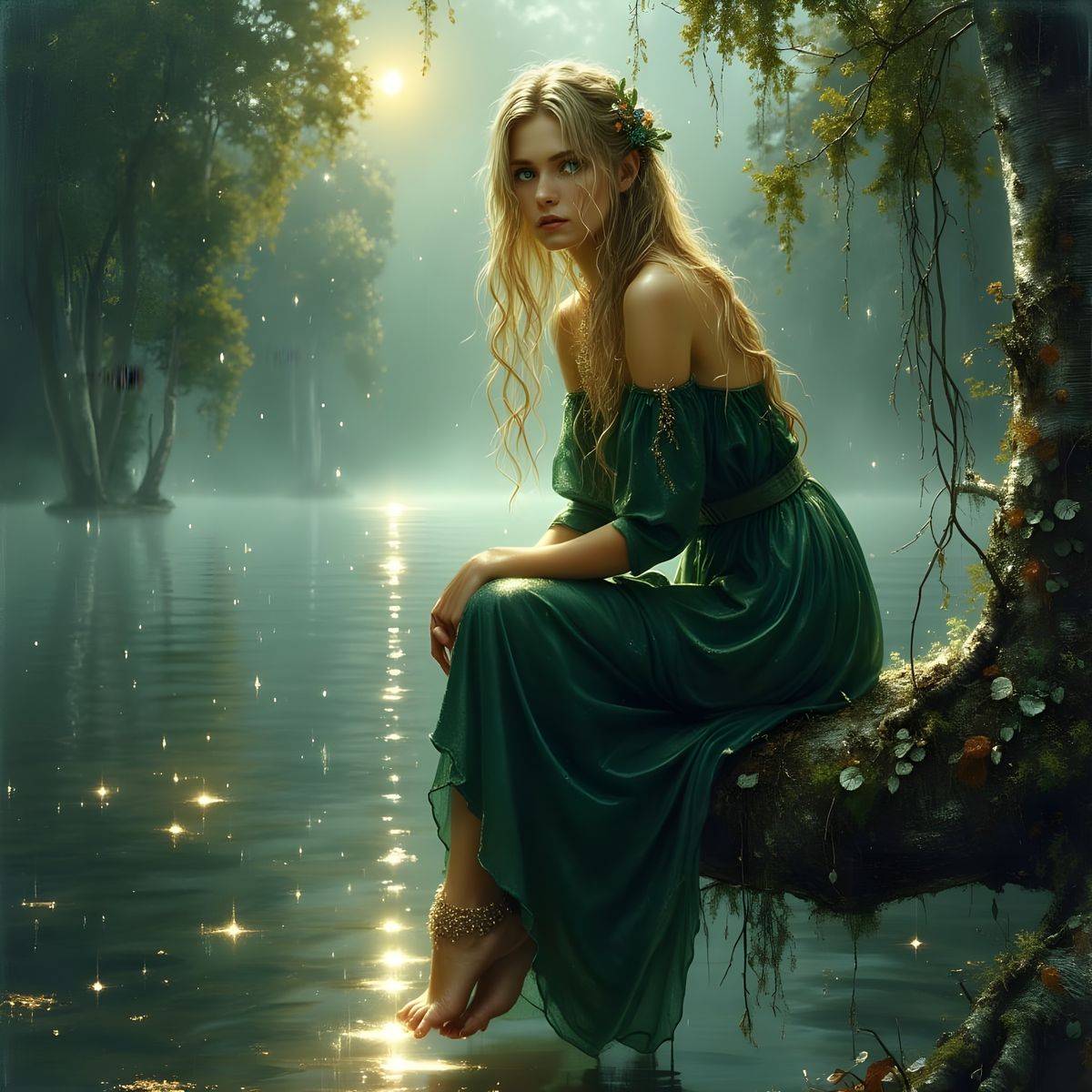This image features a beautiful Norse goddess with long blonde hair and green eyes, sitting on a tree branch by a misty lake. She wears a wet green dress and is barefoot, with moonlight reflecting on the water.