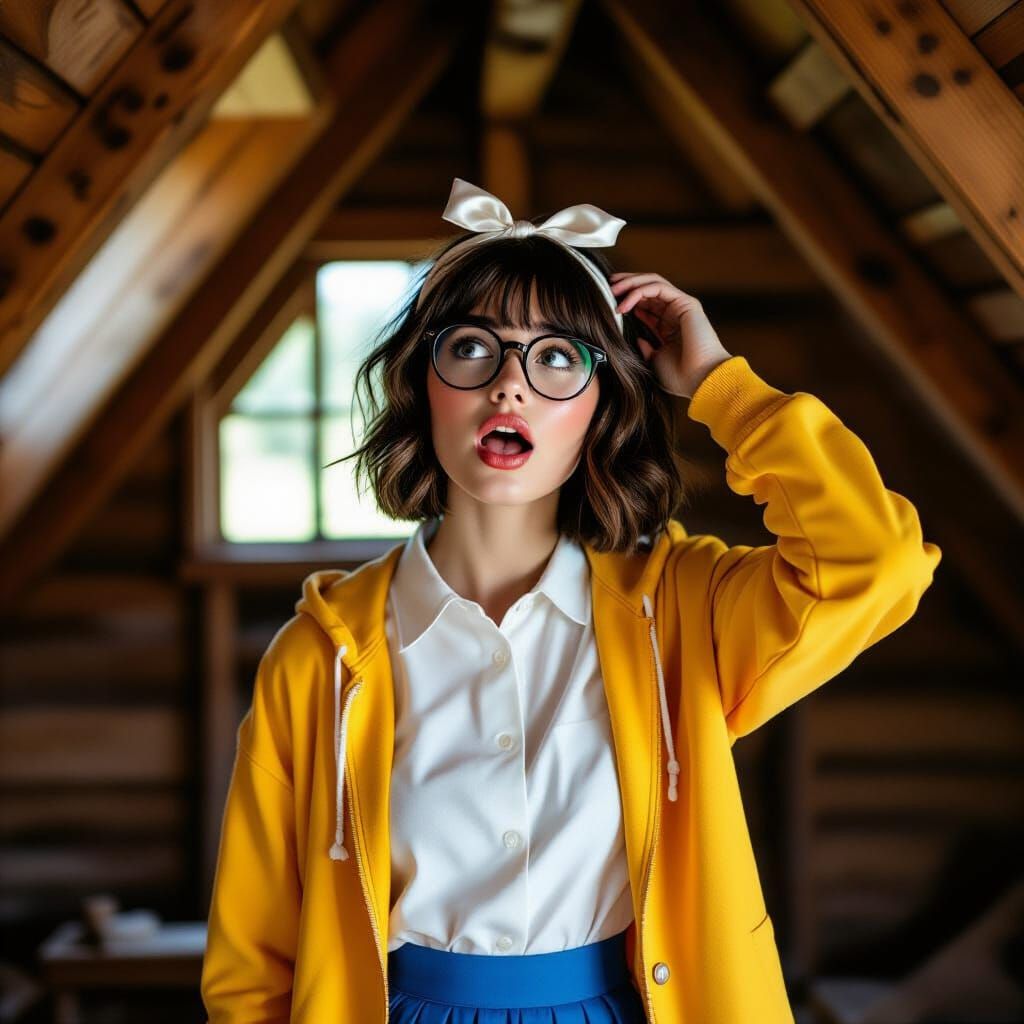 This image shows a 14-year-old girl in an attic. The photograph captures an intimate moment with warm lighting, reminiscent of candid photography with a nostalgic aesthetic. The girl has black-framed glasses and wears a blue skirt.