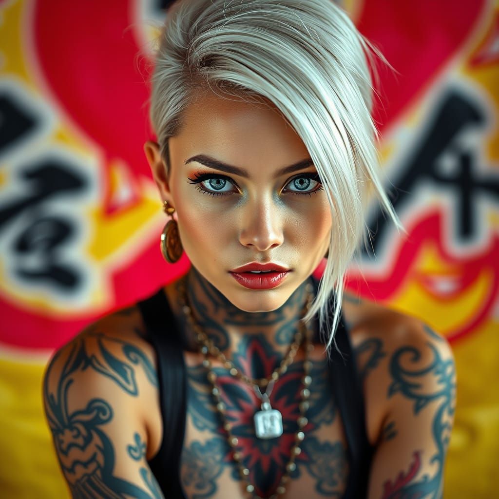 A striking picture of a young woman with Yakuza-style tattoos and platinum hair. The image is photorealistic, with intricate details and a vibrant background, reminiscent of fashion photography.