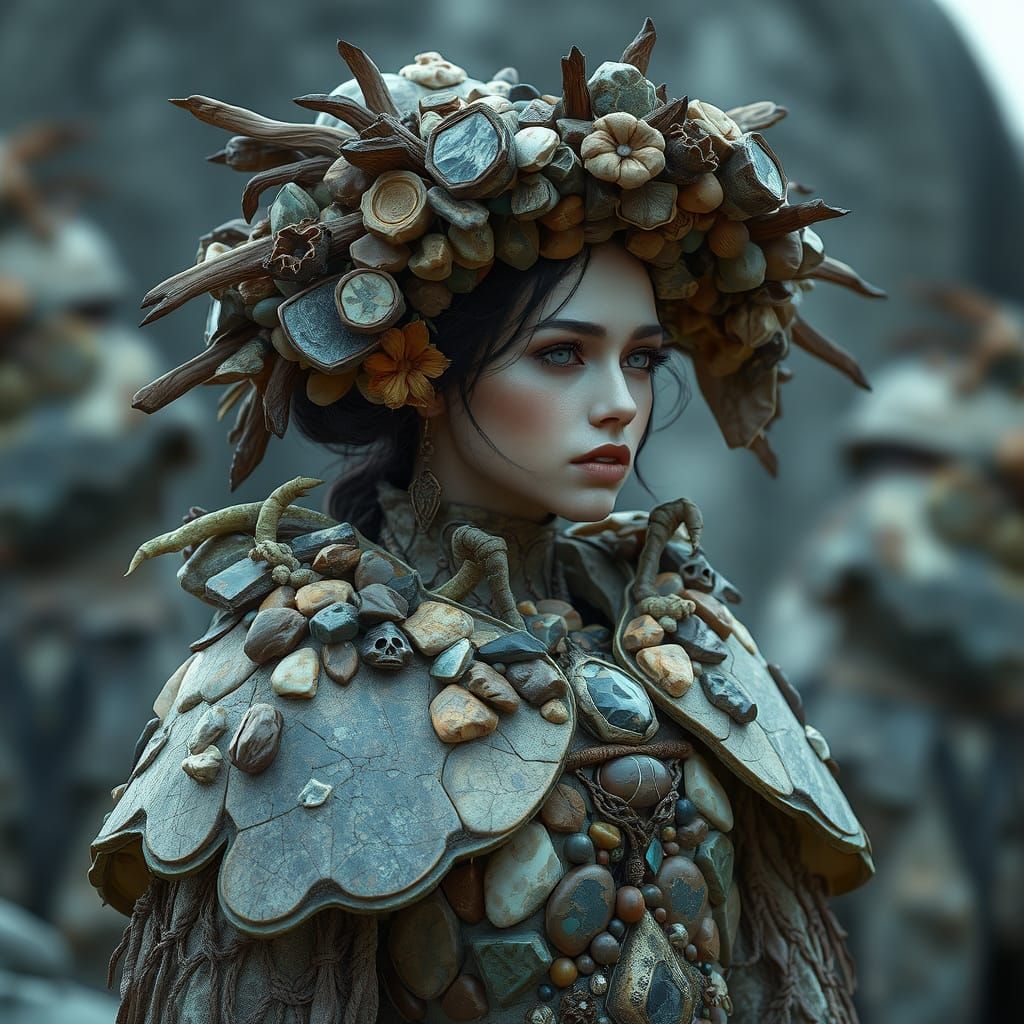 This image shows a woman in an elaborate gown made of stone and wood. The earthy tones and natural textures create an organic and geometric aesthetic.