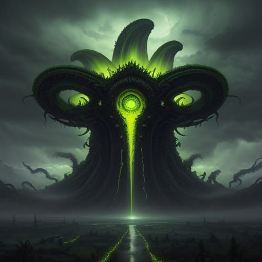 This surreal image shows a colossal Titan arum monster, Pestilothorn, as a swirling vortex of toxic energy, with tendrils stretching into the distance, set against a dark and ominous stormy backdrop.