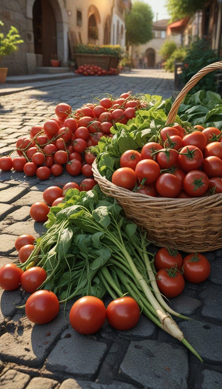 This hyperdetailed digital matte painting showcases fresh, ripe vegetables tumbling from a market basket onto a cobblestone path, bathed in warm, sun-drenched lighting.
