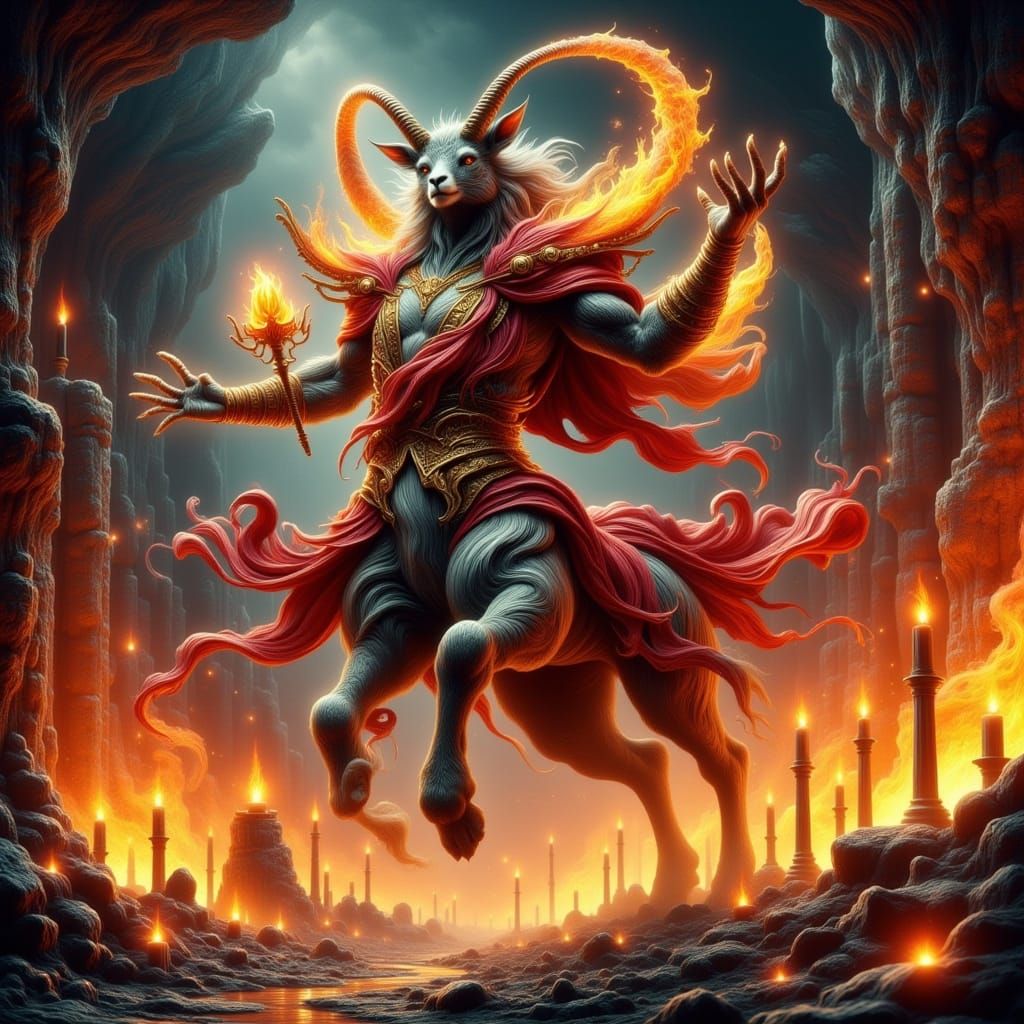 This image shows a dynamic, anthropomorphic ram in a bold, fiery pose, surrounded by flames and floating candles in a volcanic temple setting. Inspired by pulp comic art, Wick Crave embodies a passionate protector with vibrant colors and exaggerated lines.