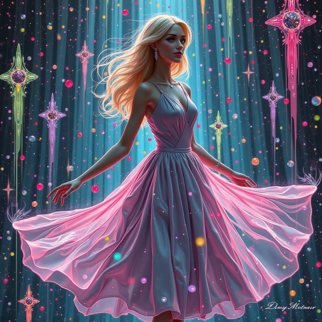 This image shows a blonde woman in a vintage dress dancing with an ethereal spirit amidst vibrant neon lights and glitch art patterns. The artwork has a futuristic neon noir aesthetic.