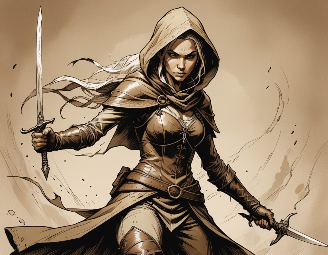 A striking image of a female elf in medieval fantasy attire, rendered in a comic book style with kinetic lines and a confident expression, as if throwing daggers in a sweeping motion