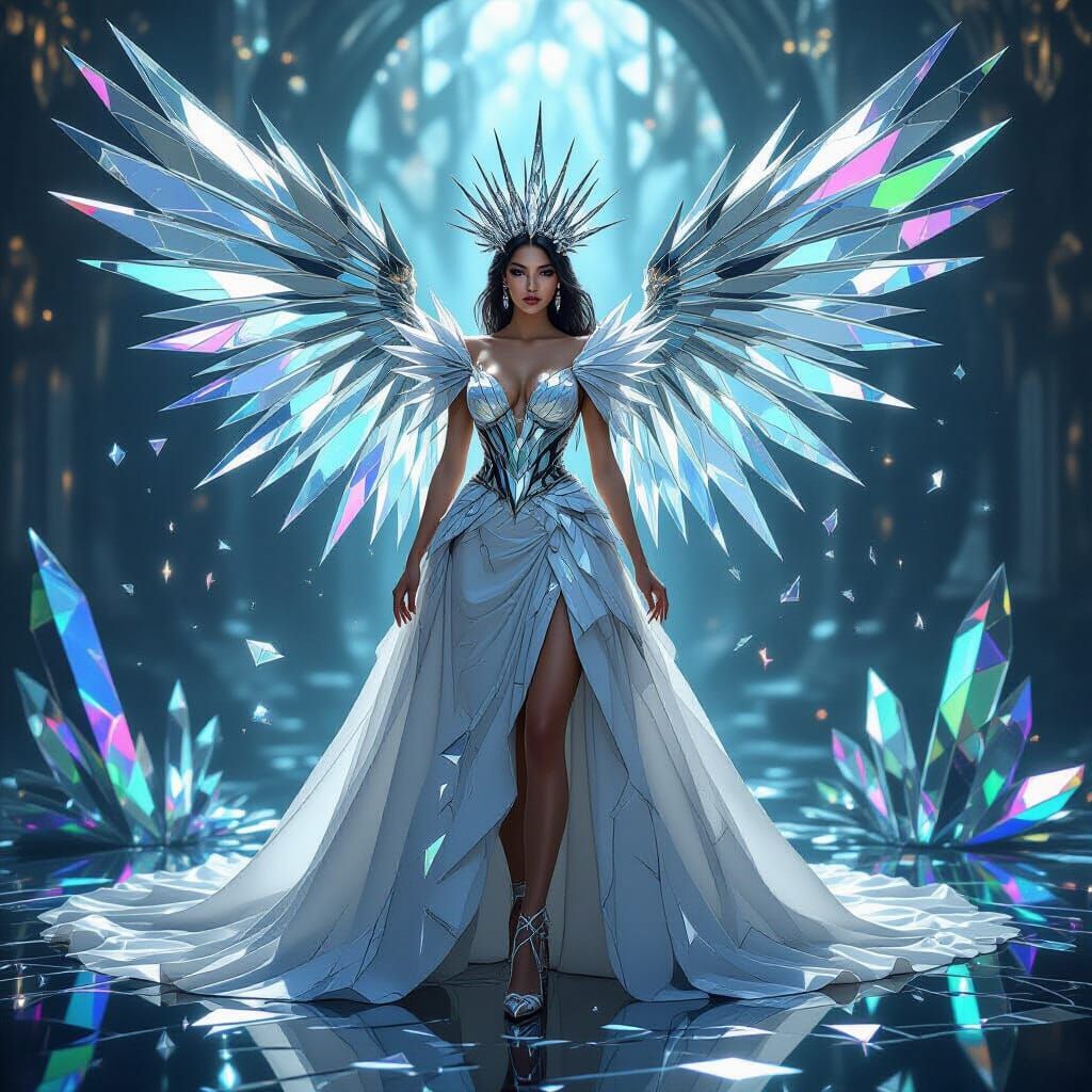 This image shows a Mirror Shard Queen in a regal pose, wearing a gown of fractured mirrors. The fantasy art features enormous wings and splintered reflections in a hyper-realistic style.