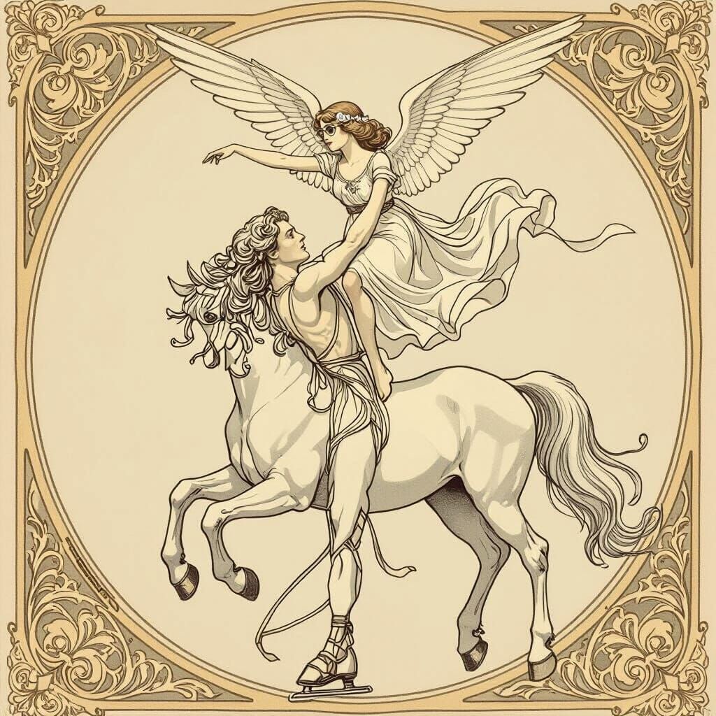 This image shows a centaur holding an angel above his head in a figure-skating pose. The pencil drawing features delicate lines, soft shading, subtle textures, and gentle hatching, creating a whimsical and wondrous scene.