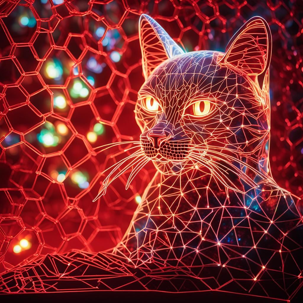 A digital rendering of a glowing cat composed of nanostructures. The cat shimmers with red iridescent light and glitter, creating an ethereal and radiant apparition.
