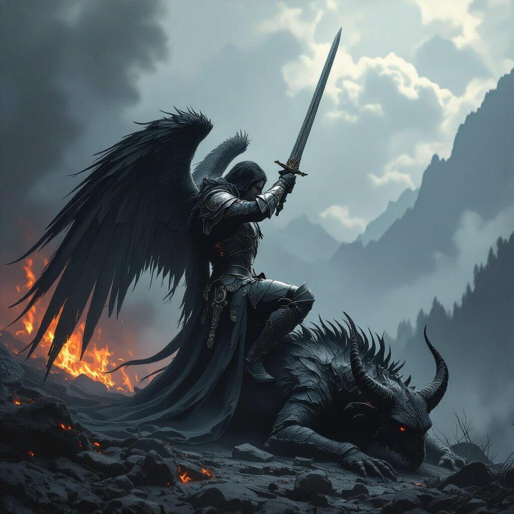 A powerful depiction of an archangel poised to strike a dying demon, rendered in a realistic black and gray style with dramatic contrast and atmospheric lighting.