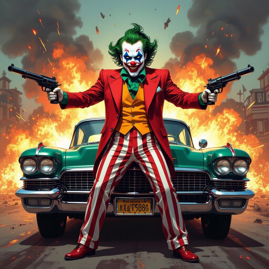 This digital painting showcases a vibrant joker clown warrior in a zoot suit before a Mad Max Cadillac with machine guns. The scene features chaotic circus fires and explosions, rendered with dramatic, high-contrast lighting and saturated colors.