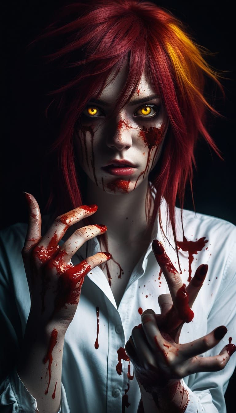 A close-up of a dark fantasy anime girl with red hair and yellow eyes, showcasing sharp claws and bloody fingers, set against a dark background with dramatic lighting and highly detailed textures.