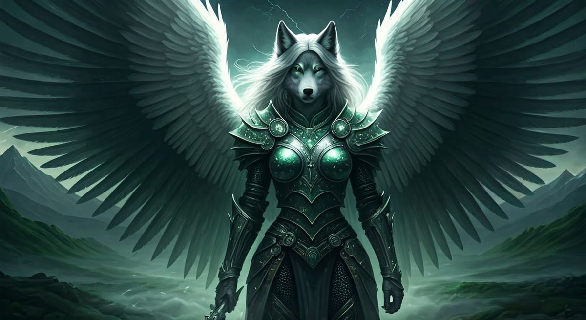 This enchanting image depicts a regal, angelic female standing heroically in a misty, mystical landscape. Her shimmering armor and flowing silver hair are set against a backdrop of rolling hills, distant thunderstorms, and vibrant emerald green and silver hues, evoking an otherworldly glow reminiscent of...