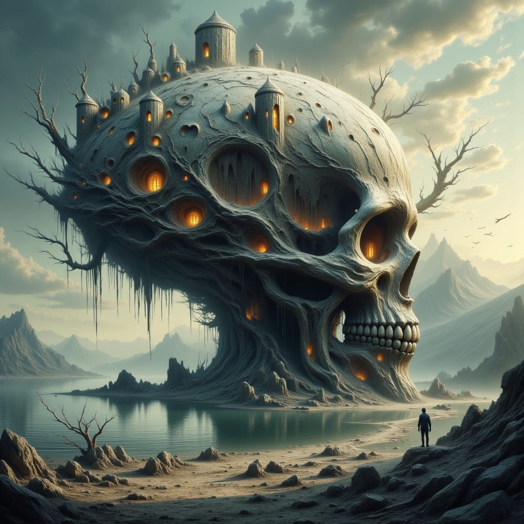 This image depicts a colossal skull-shaped structure made of organic tendrils, featuring embedded dwellings beside a reflective lake. A lone figure adds scale to the awe-inspiring, mysterious scene.